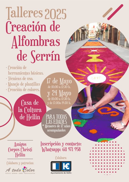 Por ello, este año, en colaboración con la empresa hellinera “A TODO COLOR”, vamos a llevar a cabo unos talleres para la creación de alfombras de serrín. Profesionales de esta empresa nos formarán en todo lo necesario para su realización: creación de herramientas básicas, técnicas de uso, manejo de plantillas y creación de colores.
