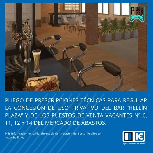 #HellínPlaza | El presente pliego tiene por objeto regular la concesión de uso privativo de dominio público del bar denominado “ Hellín Plaza » y de los puestos de venta nº 6, 11, 12 y 14, todos ellos del mercado municipal de abastos, sito en calle Mercado de Abastos y calle Águila.