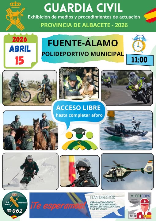 Dentro de las distintas actividades incluidas en el “PLAN DIRECTOR PARA LA CONVIVENCIA Y MEJORA DE LA SEGURIDAD EN LOS CENTROS EDUCATIVOS Y SUS ENTORNOS”, la Guardia Civil de Albacete tiene previsto realizar una exhibición de medios humanos y materiales del Cuerpo.